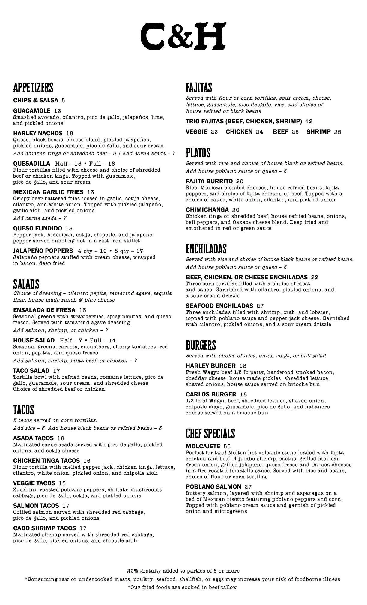 Menu for C&H featuring sections for appetizers, salads, tacos, fajitas, platters, enchiladas, burgers, and chef specials with descriptions and prices.