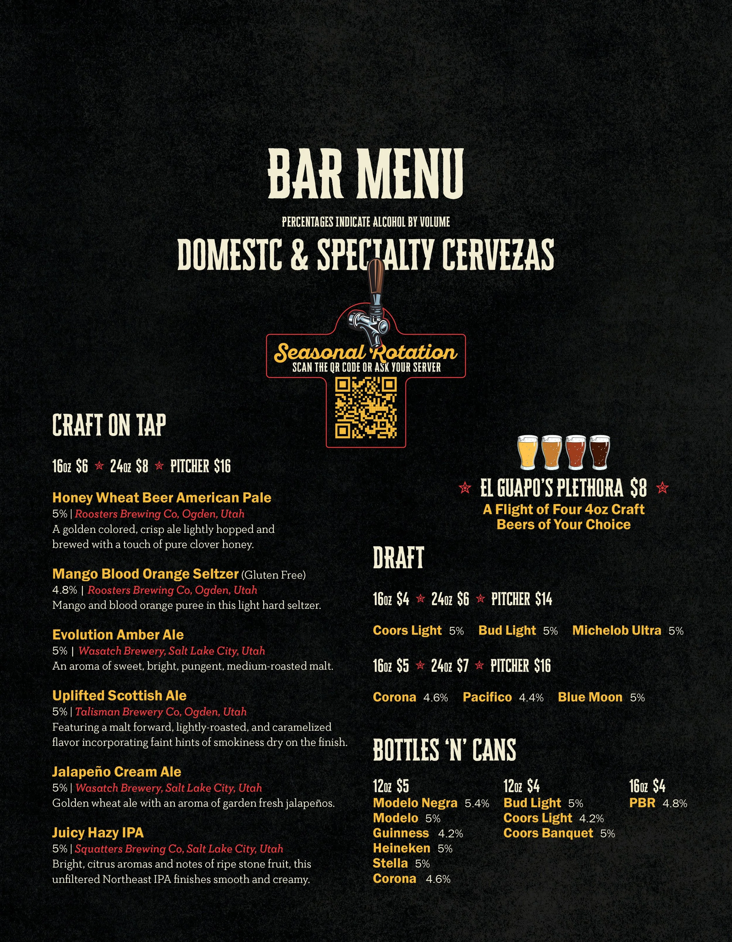 Restaurant menu featuring appetizers, salads, tacos, fajitas, platos, enchiladas, burgers, and chef specials, with prices and ingredients listed.